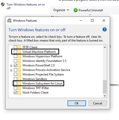 Now go to Control Panel > Programs (or Programs & Features) > Turn Windows features on or off > Tick Virtual Machine Platform and Windows Subsystem for Linux.